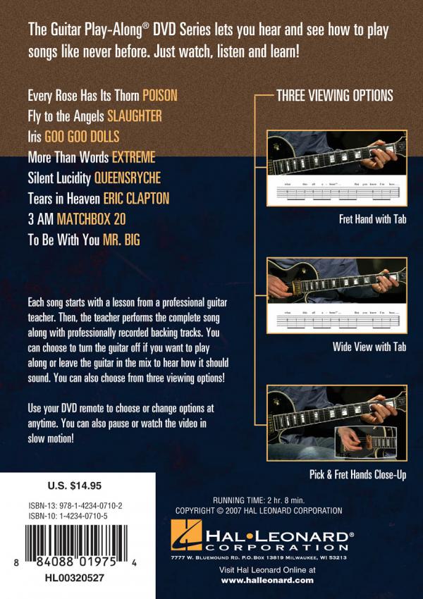 The Guitar Play-Along DVD Series lets you hear and see how to play songs like never before. Just watch, listen and learn! Each song starts with a lesson from a professional guitar teacher. Then, the teacher performs the complete song along with professionally recorded backing tracks. You can choose to turn the guitar off if you want to play along or leave the guitar in the mix to hear how it should sound. You can also choose from three viewing options: fret hand with tab, wide view with tab, pick & fret hands close-up. Each DVD includes great songs that all guitarists will want to know! Volume 3 includes: Every Rose Has Its Thorn (Poison) - Fly to the Angels (Slaughter) - Iris (Goo Goo Dolls) - More Than Words (Extreme) - Silent Lucidity (Queensryche) - Tears in Heaven (Eric Clapton) - 3 AM (Matchbox 20) - To Be with You (Mr. Big). 100 minutes.