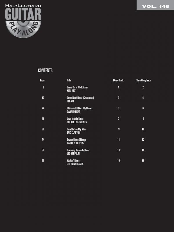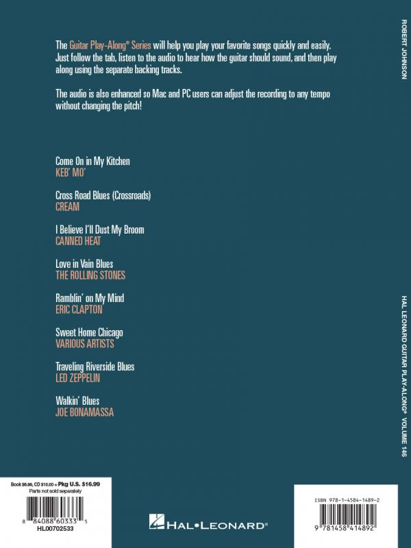 The Guitar Play-Along Series will help you play your favorite songs quickly and easily! Just follow the tab, listen to the CD to hear how the guitar should sound, and then play along using the separate backing tracks. The melody and lyrics are also included in the book in case you want to sing, or to simply help you follow along. The audio CD is playable on any CD player. For PC and Mac computer users, the CD is enhanced so you can adjust the recording to any tempo without changing pitch! This volume includes: Come on in My Kitchen • Cross Road Blues (Crossroads) • I Believe I'll Dust My Broom • Love in Vain Blues • Ramblin' on My Mind • Sweet Home Chicago • Traveling Riverside Blues • Walkin' Blues.